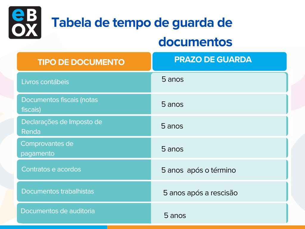 O prazo de armazenamento deve ser de 5 anos, já na tabela de tempo de guarda de documentos trabalhistas será preciso constar dois períodos diferentes, porque o registro eletrônico e a folha de pagamento precisam ficar guardados por 10 anos.
